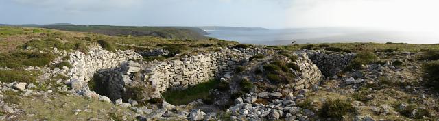 A panorama looking south across the top of Ballowall Barrow. Lands End can be seen in the distance to the right of centre. 2779x768.
