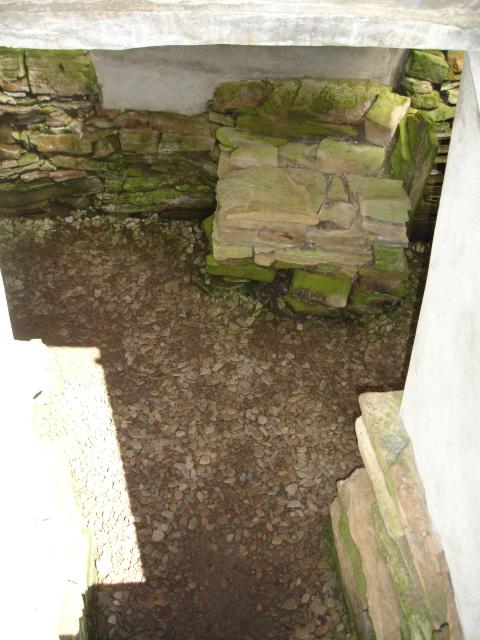 The view through the entrance. The heap of stacked stones towards the top right is one of the two later additions to the cairn. 1024x768.