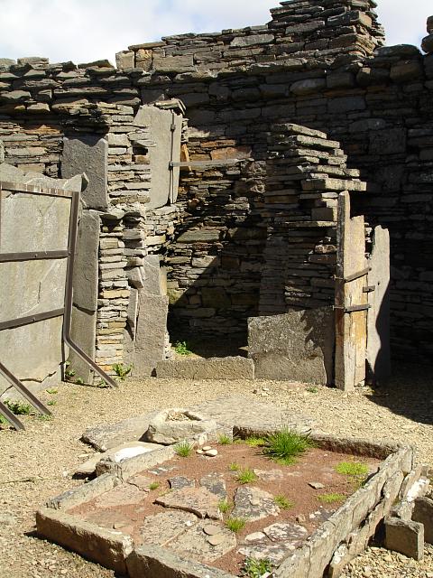 Looking towards the cubicle in the north-eastern corner of compartment D, with the hearth in the foreground and the water tank immediately beyond it. The stack of stones inside the cubicle, partly in shade in the centre-right to the left of the right-most upright reinforced with two metal braces, represent the remains of a staircase. 1024x768.
