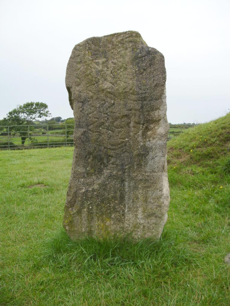 The carved standing stone at the rear of the mound.