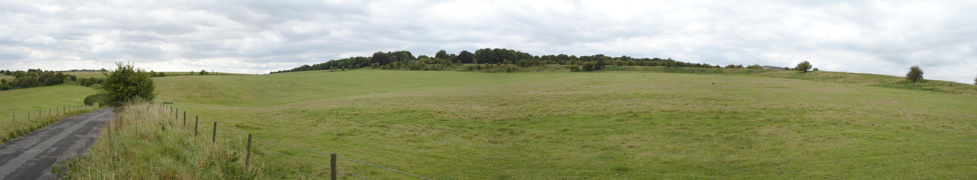 A panorama from the path running through the centre of Durrington Walls where it meets the road in the North-East of the monument, looking from the South to the West. 4148x768.