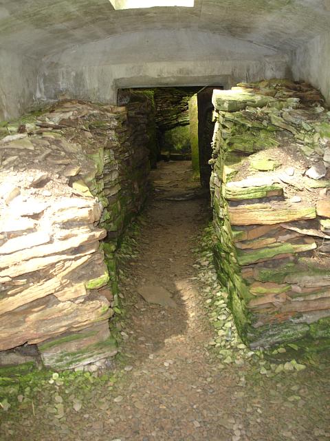 Standing on the other side of the door, looking West along the entrance passage. Note the sloping stonework to the left and right of the entrance. 1024x768.