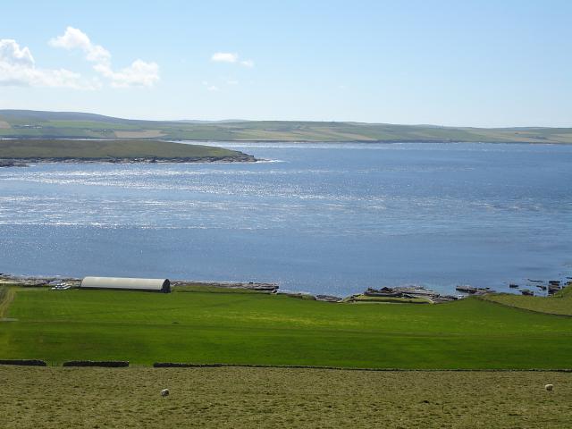Taken from the car park on the B9064, looking South-West across the Eynhallow Sound. Eynhallow itself is in the middle distance to the left with Mainland beyond. Midhowe is inside the long barn-like building to the left, and the Broch of Midhowe can be seen to the right of centre. 1024x768.