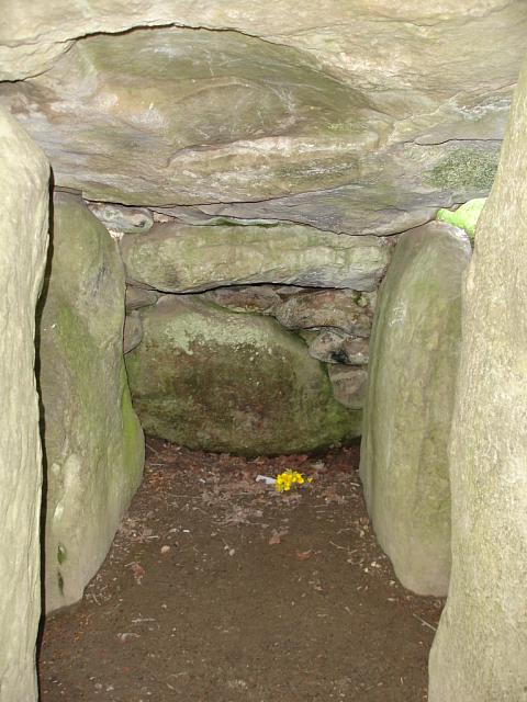 The interior of the passageway, with the entrances to the left and right chambers just visible in the foreground. The two tall pillars that form the entrance can be seen to the extreme left and right, with the two smaller pillars beyond. Note the offering that has been left behind by more recent worshippers. 1024x768.