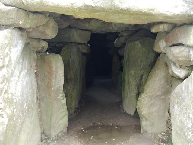 Standing in the forecourt looking into the barrow. The entrances to the South-Eastern and North-Eastern Chambers can be made out left and right respectively of the puddle in the foreground. 1024x768.