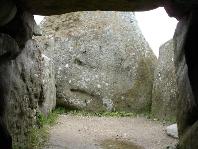 Standing at the entrance to the barrow with the great blocking stone in the centre.