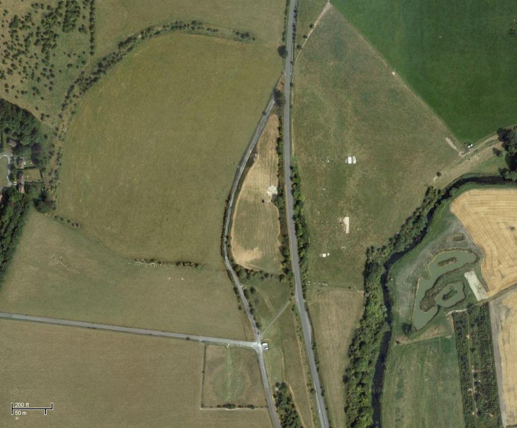 An aerial photograph of Woodhenge (bottom centre) and Durrington Walls, the large circular enclosure dominating the centre to upper left. The River Avon can be seen in the line of woods to the right. 1024x848.