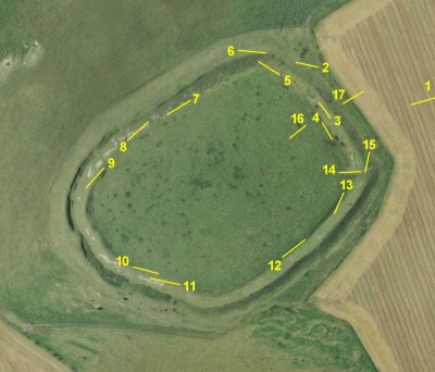Liddington Castle was constructed in four stages, likely beginning during the very late Bronze Age / early Iron Age, 7-500 B.C. In the first instance a simple soil rampart was dug and backed with a wooden palisade, then subsequent developments, possibly 5-300 B.C., increased the size of the rampart by incorporating chalk blocks into it, culminating in a final heightening some centuries later. The dating of this last stage is very imprecise, simply Iron Age, but it could possibly have occurred as late as the Roman, even the post-Roman era. Finds of pottery from these times suggest that the fort may have been re-occupied in some form, adding weight, but still no evidence whatsoever, to the Badon Hill theory.