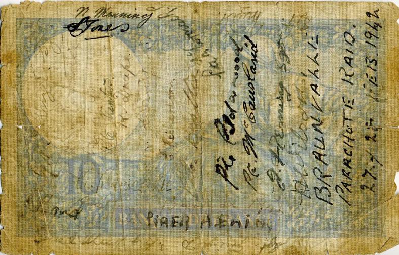 Two French bank notes, signed by approximately 60 men who participated in the Bruneval Raid. Frank McCausland's signature can be seen, written vertically in bold ink, right of centre on the final picture. Thanks to Bob Hilton.