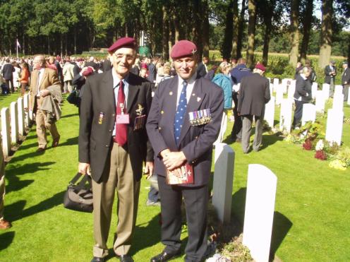 Leslie McCreesh with Bob Hilton, a more recent paratrooper, at the Oosterbeek Cemetery in September 2004. They are standing close to the grave of Corporal Rattray. Copyright: Bob Hilton.