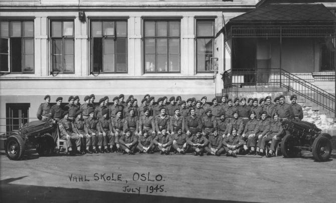 Possibly "C" Troop, 1st Airlanding Light Regiment, in Oslo, Norway, July 1945. Lance-Bombardier Robert Christie is believed to be standing at the extreme right of the back row, Staff-Sergeant Leslie Reed is seated fifth from the left on the middle row, and Lance Bombardier James Dickson is third from the left on the front row. Click here for a full-size (250kb) photograph. If you can name anyone, please contact pegasusarchive@googlemail.com and charlieparkes@googlemail.com. Copyright: Charles Parkes.