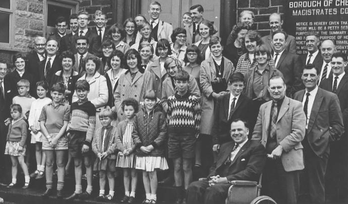 Arnhem children in England to stay with Airborne veterans, taken outside the Police Station in Chesterfield, Derbyshire, 1966. Percy Parkes is second from the right, with the word "purpose" directly above his head. Copyright: Charles Parkes.