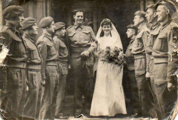 Corporal Howes on his wedding day in Spalding, 22nd July 1944. The names of the others in the photograph are written on the back in no specified order: Nobby Clarke, Ted Holt, Bill Conway, Jock Muddigan, Jack ?, Tommy Graham, Charlie Peet and Peter Cook. Copyright: Terry Howes.