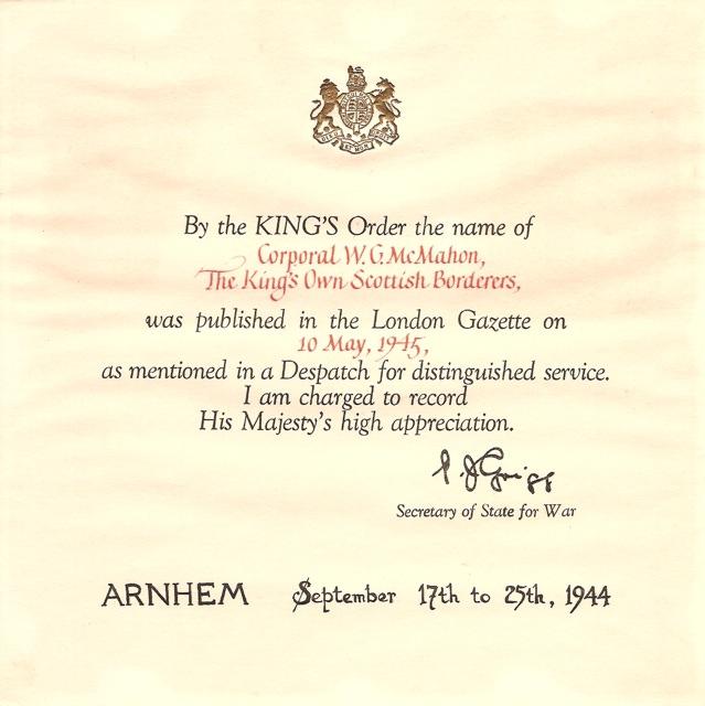 Bill McMahon's Mentioned in Despatches certificate. Copyright: Stephen Young.