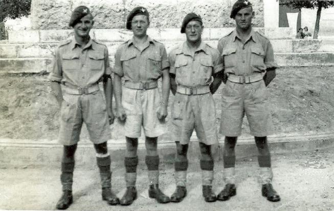 Leslie Saddler (far left) in Altamura, Italy, September or October 1943, with (left to right) A. James (POW at Arnhem), J. Smedley (U.K. Base) and K. Penfold (POW at Arnhem). Copyright: Keryl Holt.