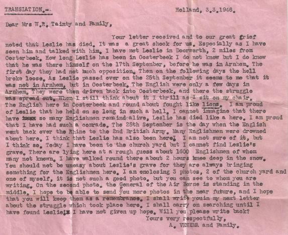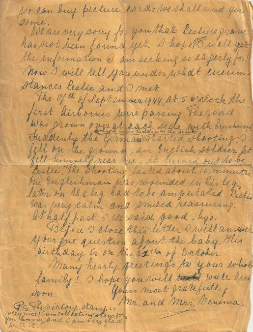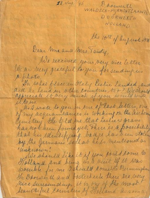 Letters to Leslie's family from Mr A. Venem, who met him in Doorworth on Sunday 17th September. Copyright: Keryl Holt.