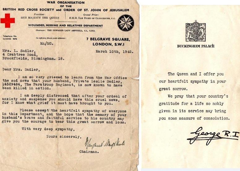 Letters confirming Leslie Saddler's death. Copyright: Keryl Holt.