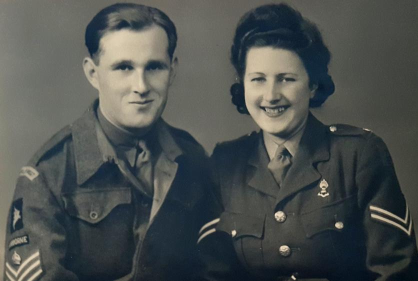 6405069 Dennis Houghton with his wife. He served with the Royal Sussex Regiment before volunteering for the Glider Pilot Regiment, and being posted to No.1 Flight, "A" Squadron. He participated in the Normandy landings, flying a glider alongside Sergeant D.H. Tincombe. He was taken prisoner at Arnhem and sent to Stalag XIB at Fallingbostel, POW number 117498. In early 1945, he was forced onto the Long March away from the advancing Russians, later escaping and finding his way to the Allies lines. After the war he returned to the Royal Sussex and retired from the Army in 1966 as a Sergeant Major, then joining the Territorial Army and becoming a Major. He was also a councillor and became Mayor of Bexhill. He died in 1991, aged 69. Copyright: Di Robinson.