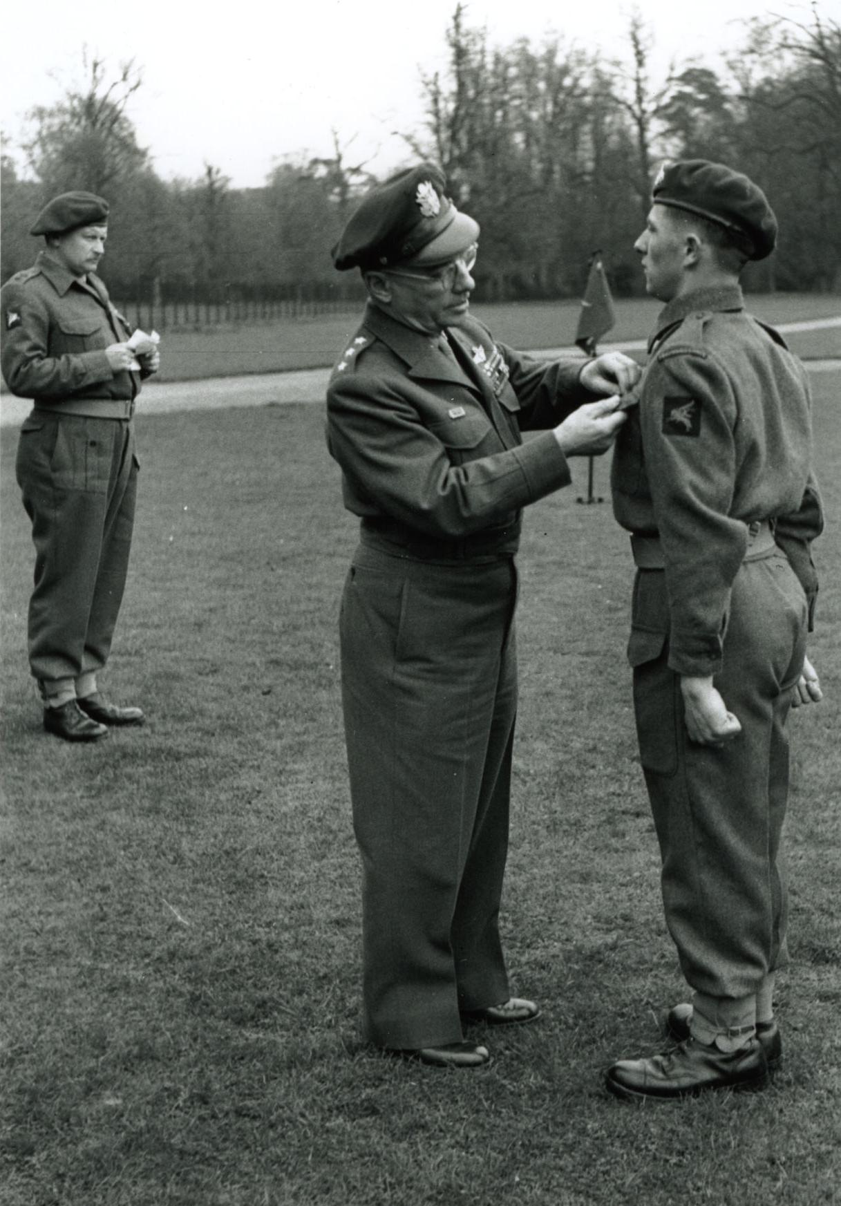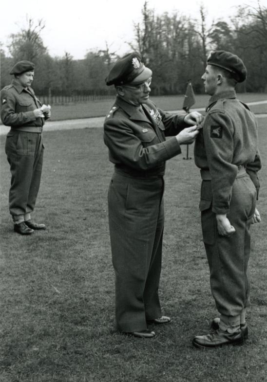 Trooper Frank Mann receiving the Distinguished Service Cross from Lieutenant-General Brereton, 8th April 1945. The ceremony was held in the grounds of Belton Hall Park, and was attended by 300 men who had been at Arnhem. In the background is Lieutenant-Colonel Charles Breese, 1st Battatlion The Border Regiment. Larger image. Copyright: IWM H 41630.