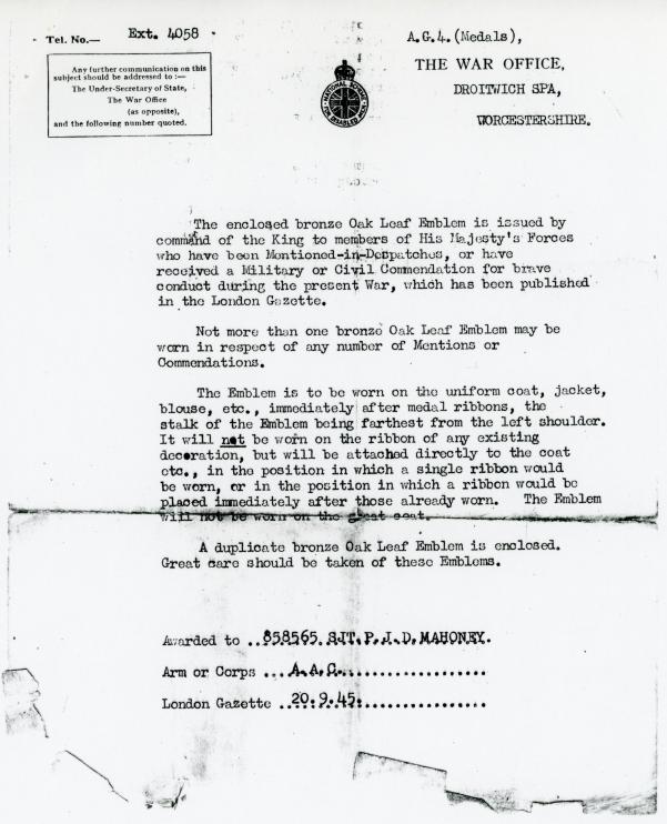 Sergeant Mahoney's Mentioned in Despatches notification.