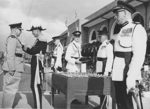 Major Neill (left) receiving the Colonial Police Medal on the 7th January 1956.