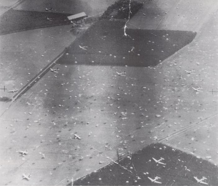 Parachutists landed or still descending on DZ-X. Note the landed Horsa's at the bottom left, and also the C-47's, bottom right and along the top, on their way home after dropping their sticks. Copyright: Ministry of Defence.