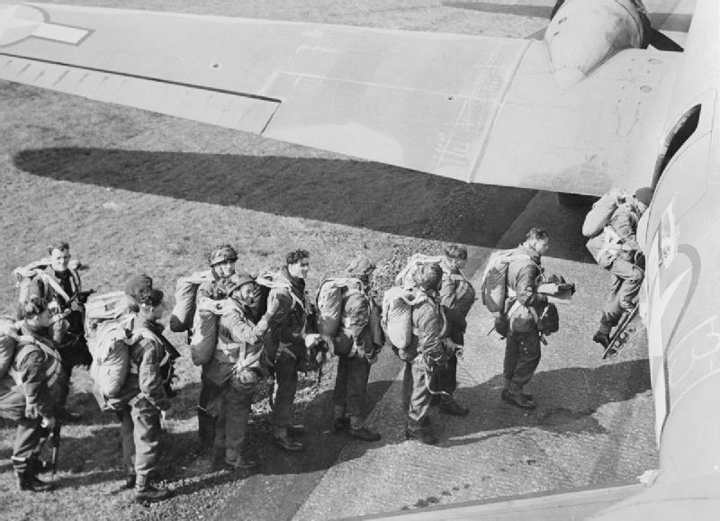 Parachutists climbing aboard an American C-47 on Sunday 17th. The bare-headed man at the bottom left is Private Kevin Heaney, and missing off the left of the photograph should be Privates McCarthy and Ted Mordecai, all of the 1st Airborne Divisional Field Park. The remaining men are all of the 1st Parachute Brigade Defence Platoon. Copyright: IWM K7588.