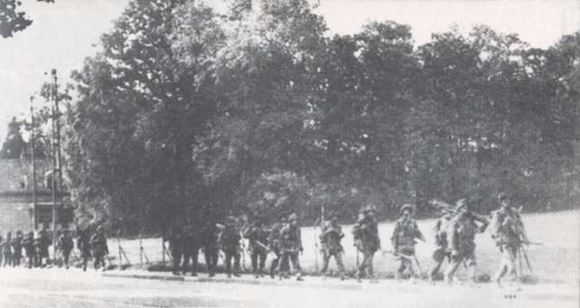 Airborne soldiers, possibly 3rd Battalion, marching along the Utrechtseweg out of Oosterbeek on Monday 18th. Copyright: Adrian Groeneweg.