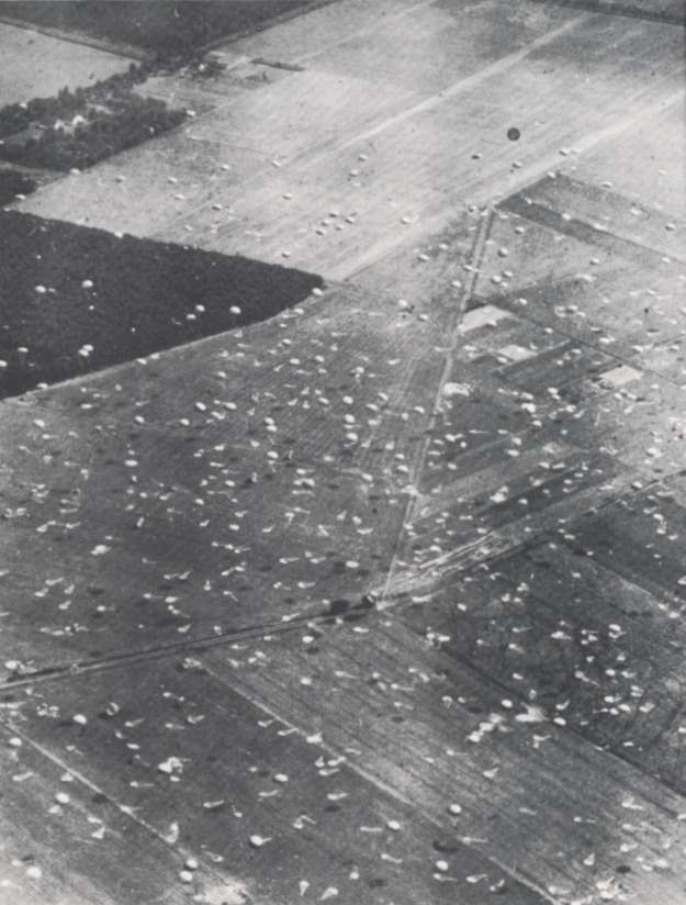 Parachutes scattered over DZ-X, whilst yet more men descend. Copyright: IWM CL1168.