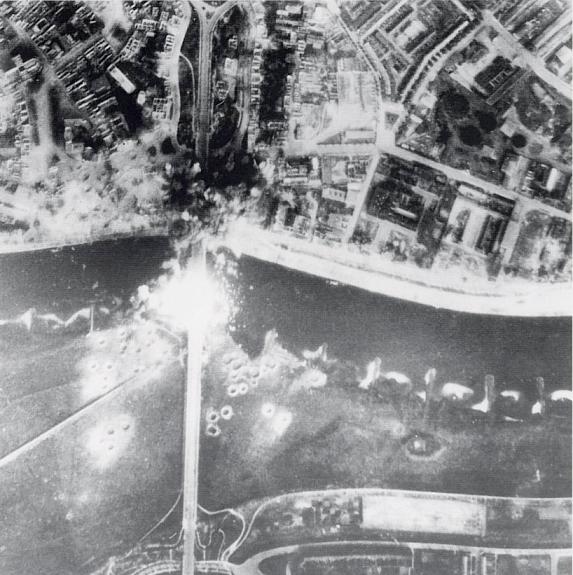 Arnhem bridge being destroyed by American bombers on the 7th October. Copyright: Airborne Museum, Oosterbeek.