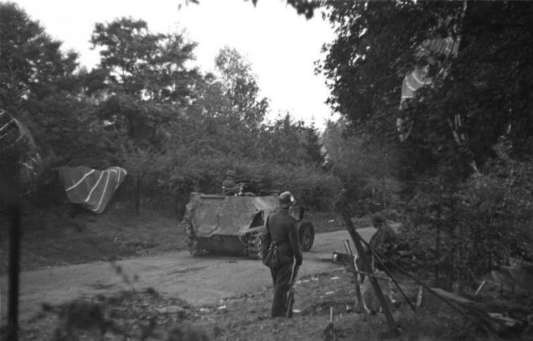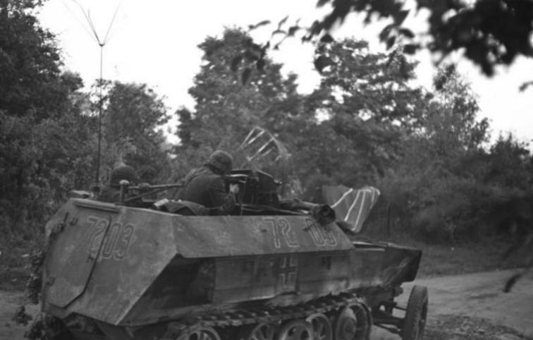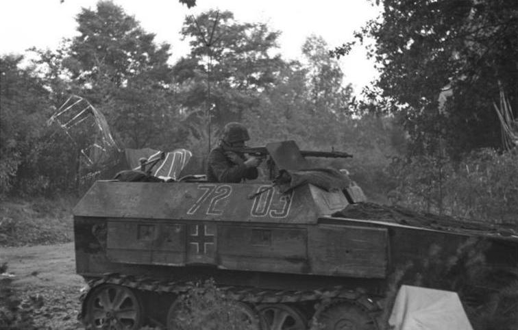 An SDKFZ 250/3 of the 9th S.S. Reconnaissance Battalion, but now a part of Kampfgruppe Spindler, in action on the Dreijenseweg on Wednesday 20th September 1944. This was one of the few vehicles which the Reconnaissance Battalion left behind in the Arnhem area whilst the main body, under Captain Victor Graebner, proceeded to Nijmegen and came grief as they attempted to recross Arnhem Bridge from the south on Monday 18th September. Copyright: Bundesarchiv.