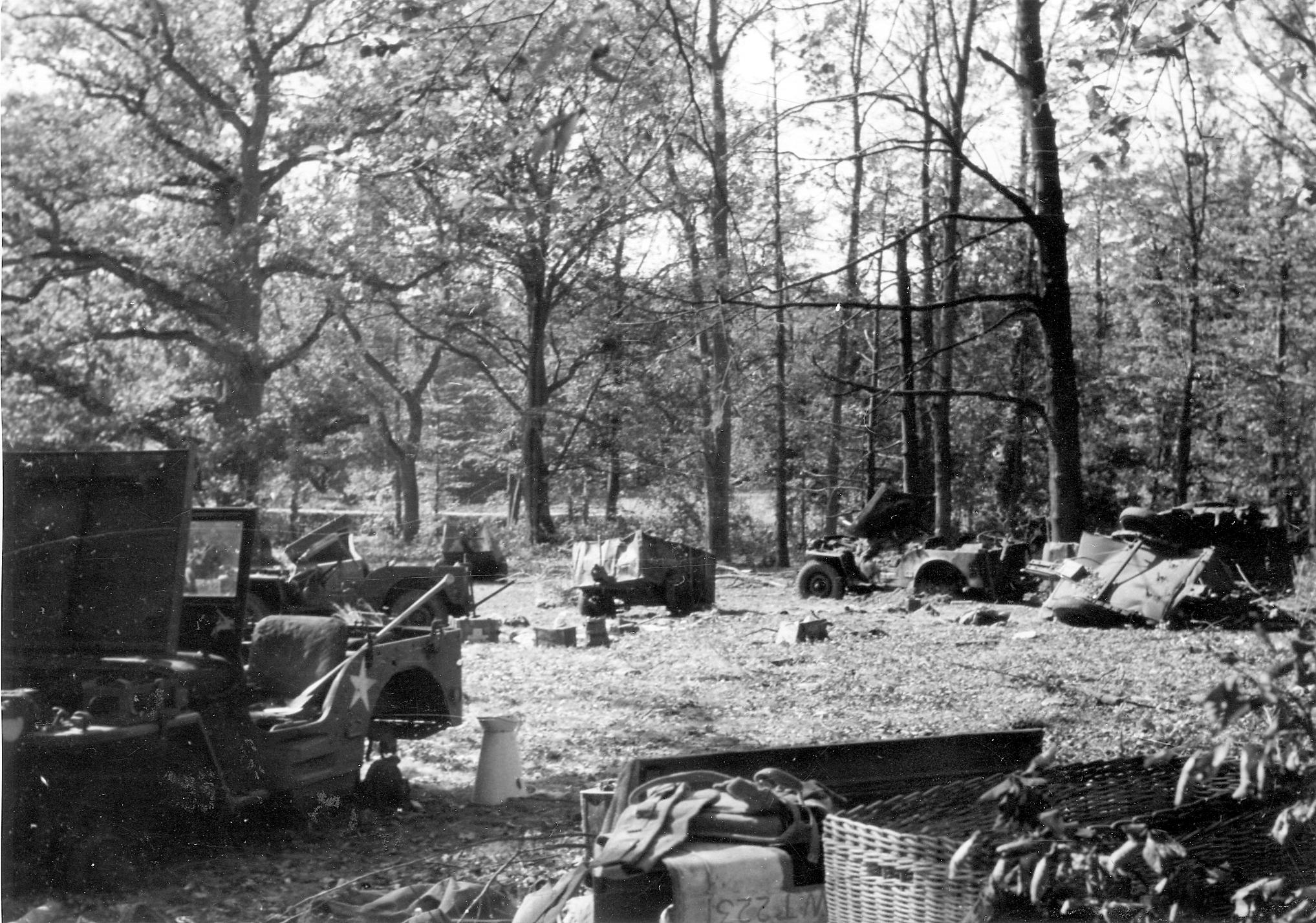 Abandoned and wrecked Jeeps in a woodland clearing after the Battle. Larger image. Copyright: Bundesarchiv 590/2330/38.