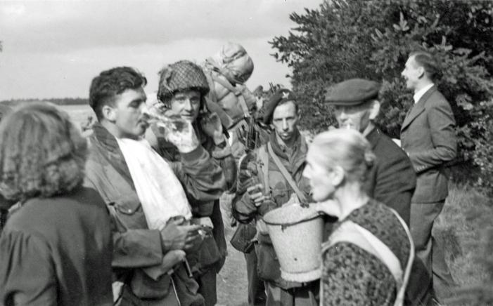 Sergeant Jim Travis (left) of the 21st Independent Parachute Company, accepts a drink from Dutch civilians off DZ-X. The picture was taken shortly after the 1st Parachute Brigade had jumped over the zone. Travis has his arm is plaster and is wearing a sling. He had broken a bone in his wrist shortly before Market Garden, but had insisted on accompanying his No.1 Platoon into action to carry out his duties, which he performed admirably. Standing just to the right of him, wearing a helmet, is Sergeant Bert Tennuci of the 16th Parachute Field Ambulance. Larger image. Copyright: IWM BU1102.