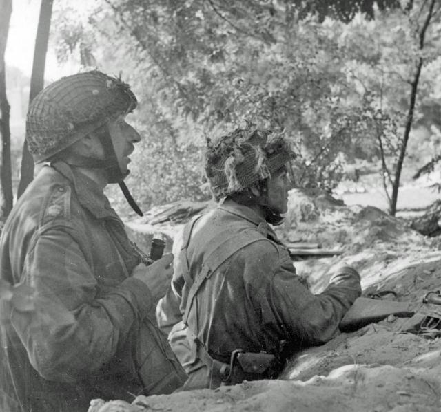 Two officers of the 1st Border, Major William "Jock" Neill (left), commander of "C" Company, and Lieutenant John McCartney, commander of No.28 Medium Machine Gun Platoon, in a foxhole on the Van Lennepweg on the 20th September. Both men survived the Battle and were evacuated across the Rhine when the Division withdrew. Larger image. Copyright: IWM BU1102.