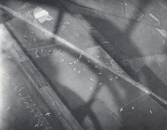 Gliders, as seen through the cockpit of a passing aicraft, scattered across LZ-S on Sunday 17th September. Copyright: Airborne Museum, Oosterbeek.