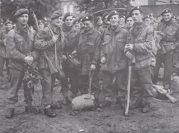 Men of the 1st Border, evacuated from Arnhem, at Louvain on the 27th September. On the same day they were flown home to England. Left ro right: Sergeant Tom Bate, Corporal W. Clarke, Unknown, Privates H. Blakeley, Cyril Pryke, Sandy Masterson, Paddy Quinn, Harold Spink, Cyril Stones, Unknown, Privates Ernie Westerman, and Wilf Pridmore. Copyright: Border Regiment Museum.