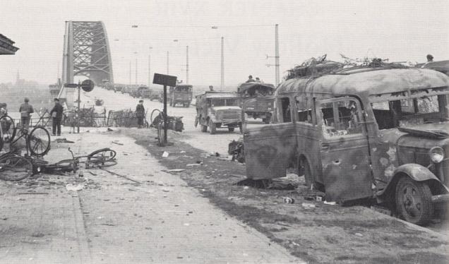 Vehicles of XXX Corps pour across Nijmegen Bridge amidst scenes of the battle before its capture. Copyright: Imperial War Museum.
