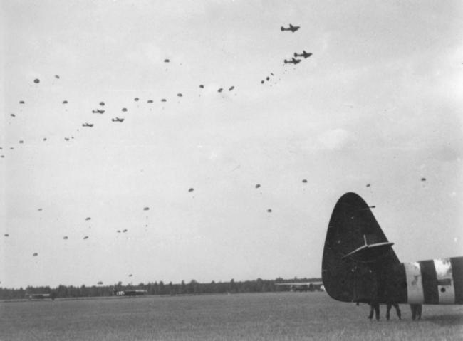 Paratroopers, probably the 2nd Battalion, jumping over DZ-X on Sunday 17th September. The scene was captured by Sergeant Smith of the Army Film and Photographic Unit. Copyright: IWM BU1161.