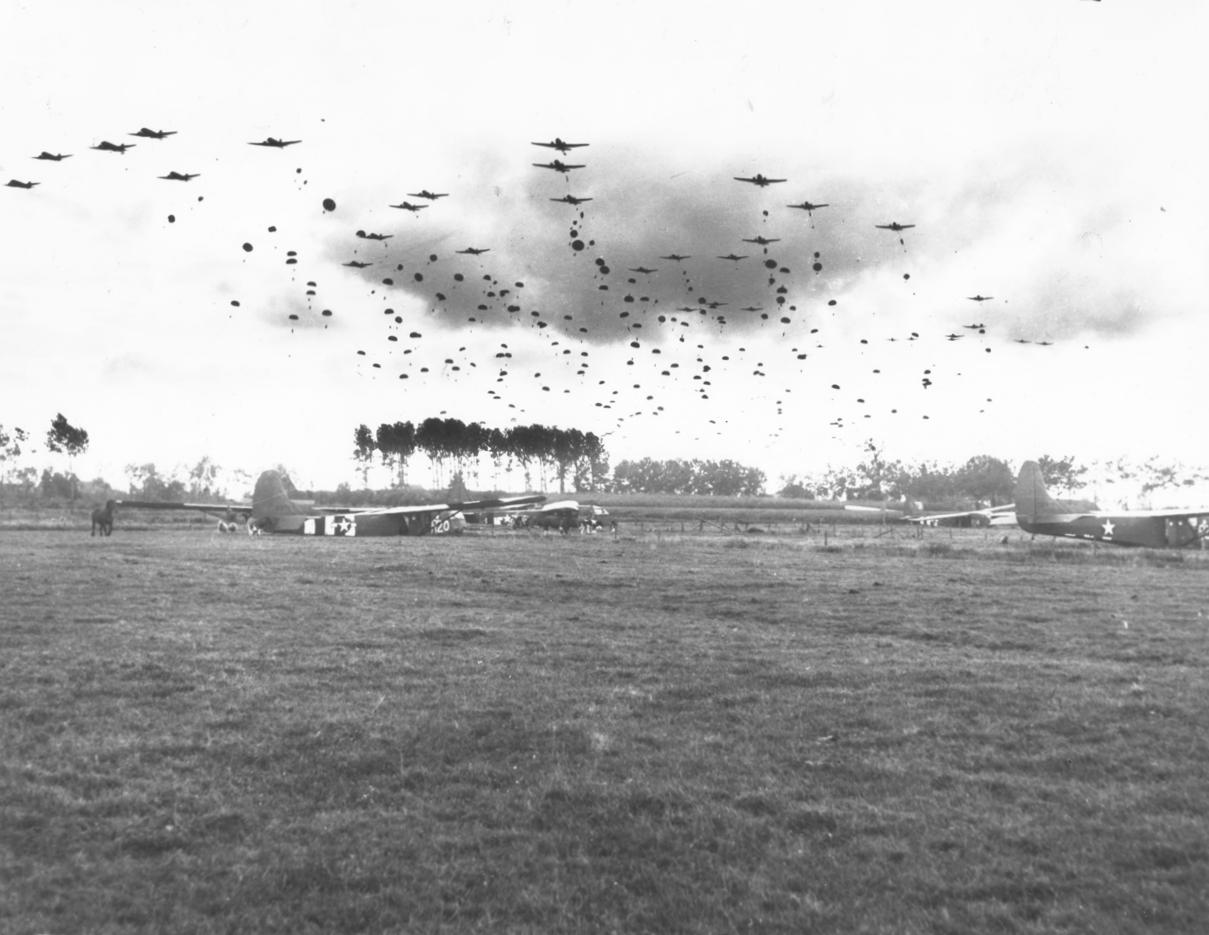 The remainder of the Polish Brigade, who should have jumped over Driel on Thursday 21st but turned back due to worsening weather in England, finally landing near Grave, in the 82nd Airborne Division's area, on the 23rd September. Larger image. Copyright: Bevrijdingsmuseum Groesbeek.