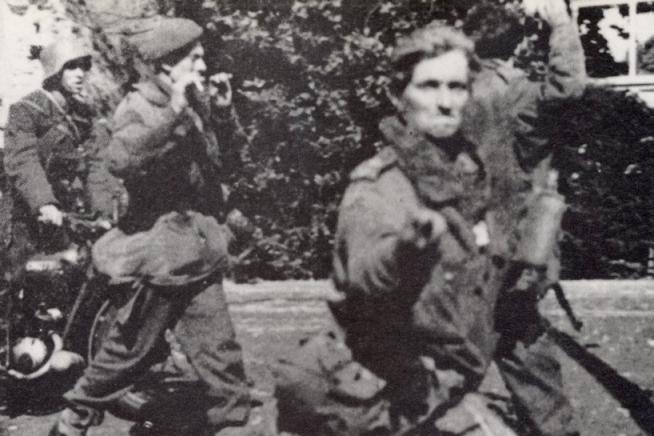 Men of the 2nd South Staffords being led away to captivity on Tuesday 19th September. The man second from the left is Signaller George Parry, and in the foreground, looking towards the German cameraman and in the process of sticking his fingers up at him, is Lieutenant Jack Reynolds. Reynolds was already angry at the destruction of the Battalion, but when he observed a cameraman grinning as he filmed the captured men being marched past, he decided to express his opinion of him. Copyright: Bundesarchiv 497/3531A/34.