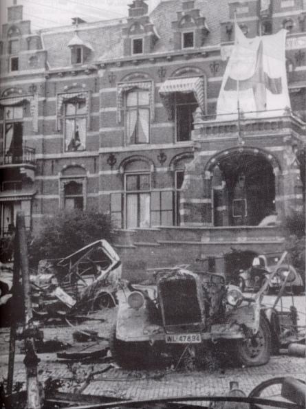 Wreckage around the St Elizabeth Hospital, possibly as a result of an ambush laid by the 2nd Parachute Battalion's "C" Company. The Red Cross was put in place on the 17th or 18th September by Private John Battley, of No.4 Section, 16 Parachute Field Ambulance. Copyright: Bundesarchiv 497/3527/11A.