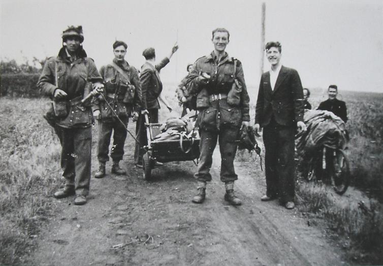 Members of the 2nd Parachute Battalion's Mortar Platoon leaving the drop zone on Sunday 17th September 1944. Left to right: Sergeant A. Jackman, Private R. Pope, Dutch civilian with the mortar barrow, Private Len Hoare, more civilians helping. Copyright: Len Hoare.