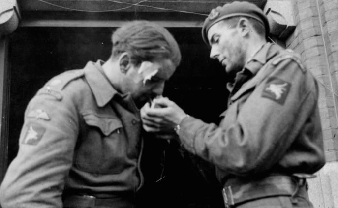 Major Lonsdale (left), Second-in-Command of the 11th Parachute Battalion and commander of the Lonsdale Force at Arnhem, accepts a light from Lieutenant David Polley, "C" Section (lines), 1st Airborne Divisional Signals, after the battle at Nijmegen on the 26th September. Copyright: IWM BU1131.