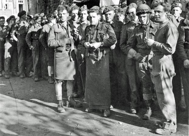 British troops, in various stages of undress due to swimming the Rhine, in Nijmegen after the withdrawal. On the right (bareheaded) is Craftsman Terry Criddle (Advanced Worshop REME) with Driver McCrae (of the Seaborne Tail of the same unit) next to him. Looking over the shoulder of the man wearing the blanket in the centre of the photo (the right-most of the two blanket-wearers) is Sergeant J. W. Denning (HQ Platoon, 9th Field Company RE), and over the same mans right shoulder is Gunner Tom Henney ("X" Troop, 2nd Airlanding Anti-Tank Battery RA). Larger image. Copyright: IWM BU1130.