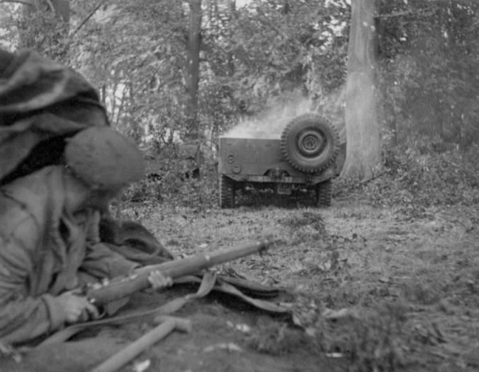A soldier looks on as a Jeep, hit by a mortar, burns itself out near the Hartenstein Hotel. The photograph was taken by Sergeant Dennis Smith, of the Army Film and Photographic Unit, on the 24th September 1944. Larger image. Copyright: IWM BU1140.