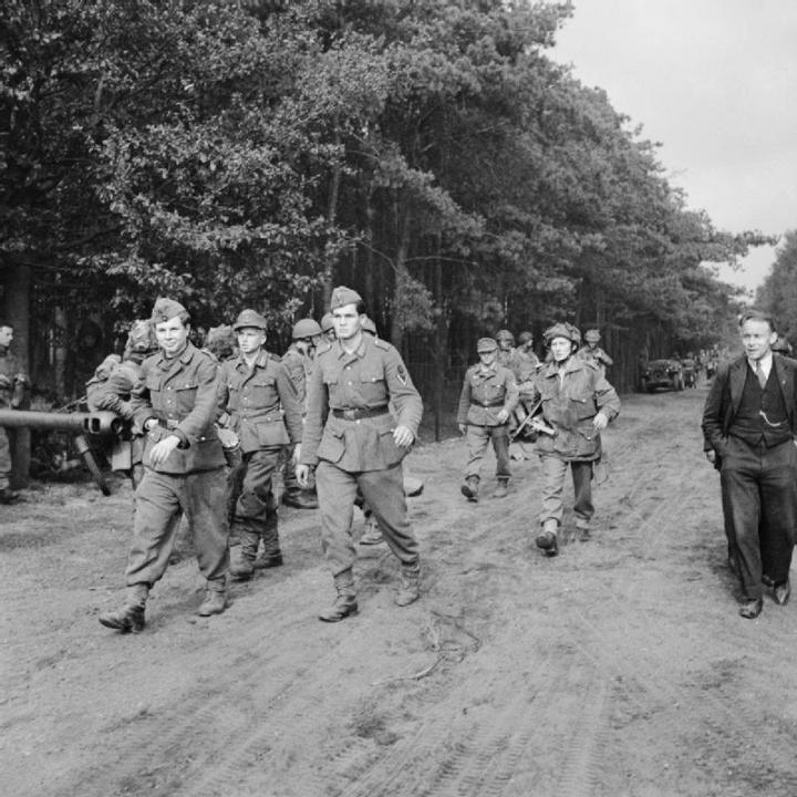 German Prisoners of War being escorted to Wolfheze on Sunday 17th September. Larger image (part of photograph missing). Copyright: IWM BU1166.