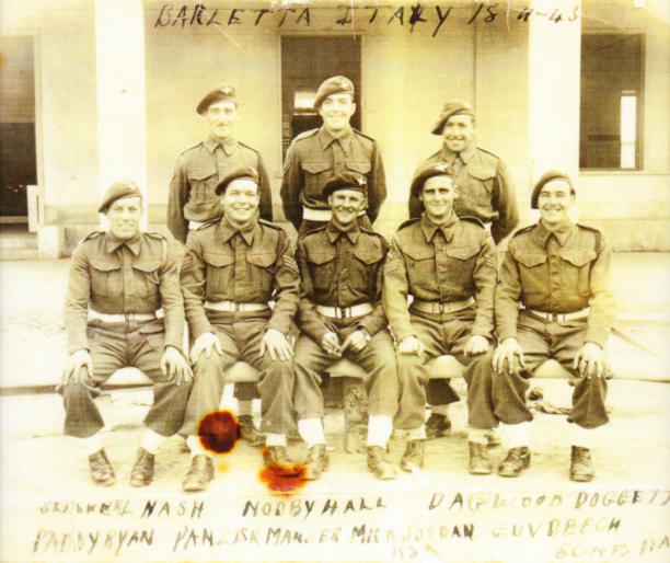 Back row, left to right: Corporals Leslie Alfred Nash (KIA 17/09/44 when with No.3 Platoon, "R" Company) and E. J. "Nobby" Hall (Wounded at Arnhem and escaped on Operation Pegasus) and Private W. "Dagwood" Doggett (served with the Medium Machine Gun Platoon at Arnhem and was evacuated across the Rhine on the 25/26th September 1944).
