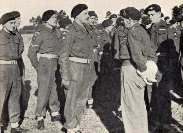 Lt-Colonel Alastair Pearson (right) with Field Marshal Montgomery (second right), during an inspection of the 8th Battalion. Montgomery is exchanging a few words with John Marshall, Pearson's Second-in-Command. Left to right: Sergeant Hutchinson, Private Arthur Platt (partially obscured, murdered on the 6th June 1944) and Lance-Corporal Ford.