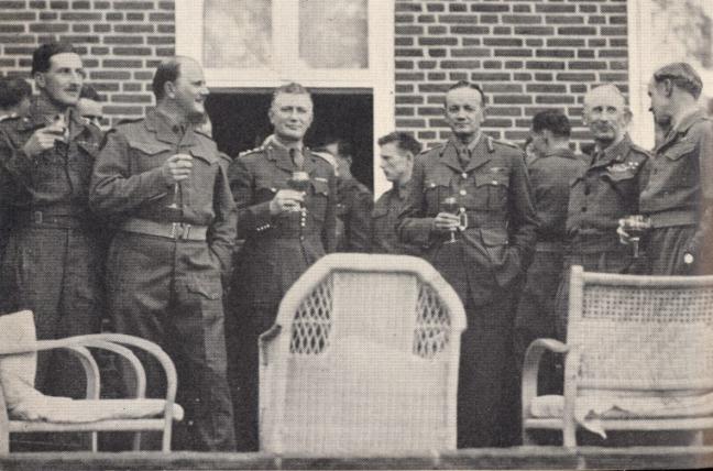 Brigadier Mills-Roberts attending a post-war cocktail party in Oldenburg. Left to right: Brigadier Balfour (VIII Corps), Peter Bartholomew (Commander No.3 Commando), Brigadier Mills-Roberts, General Lyne (7th Armoured Division), General Barker, Tony Lewis (Commander No.6 Commando).