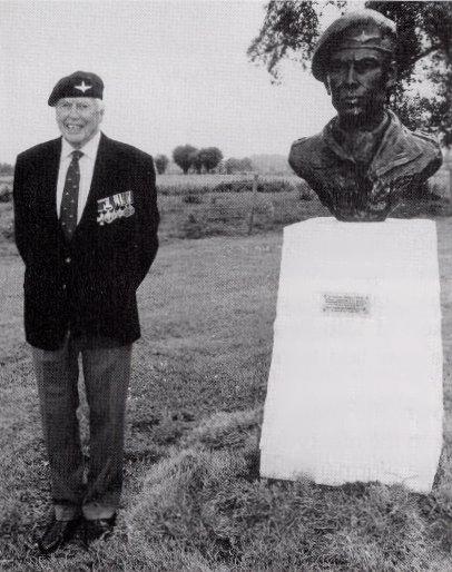 Lieutenant-Colonel Terence Otway in 1998, standing beside a bust of himself at the Merville Battery.